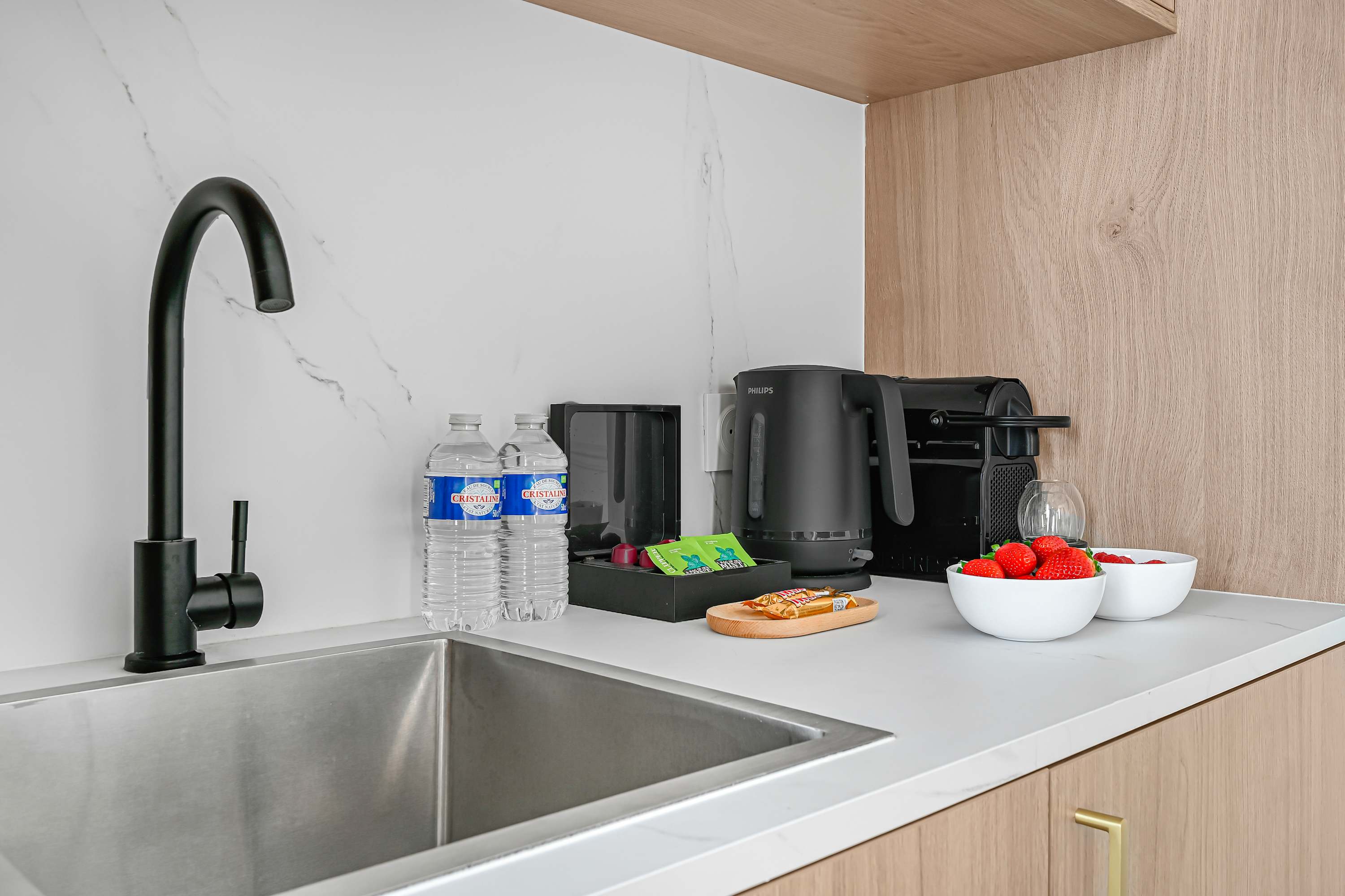 • Une cuisine moderne entièrement équipée : cafetière, bouilloire, plaque de cuisson, réfrigérateur/congélateur et le nécessaire pour cuisiner.