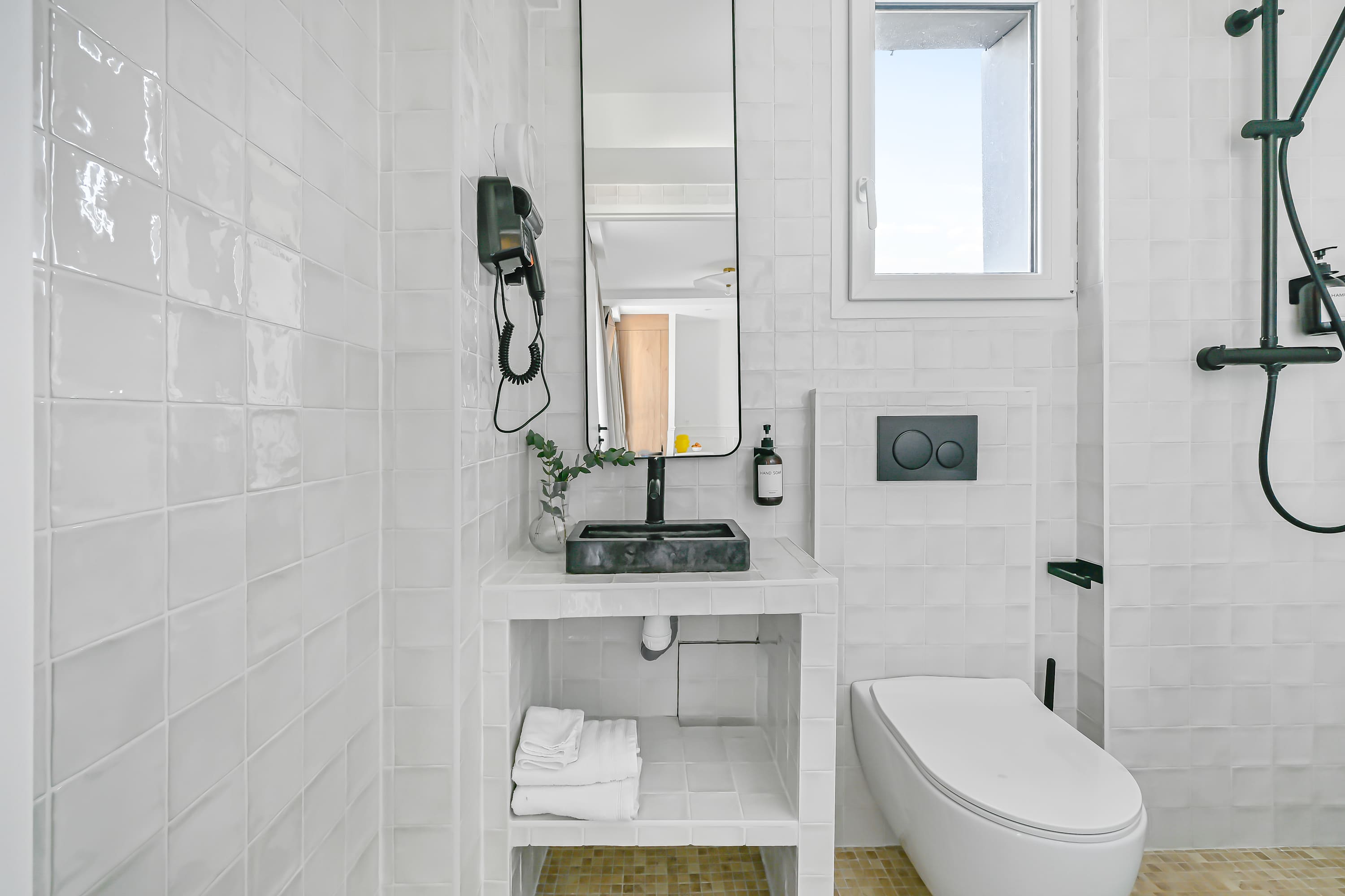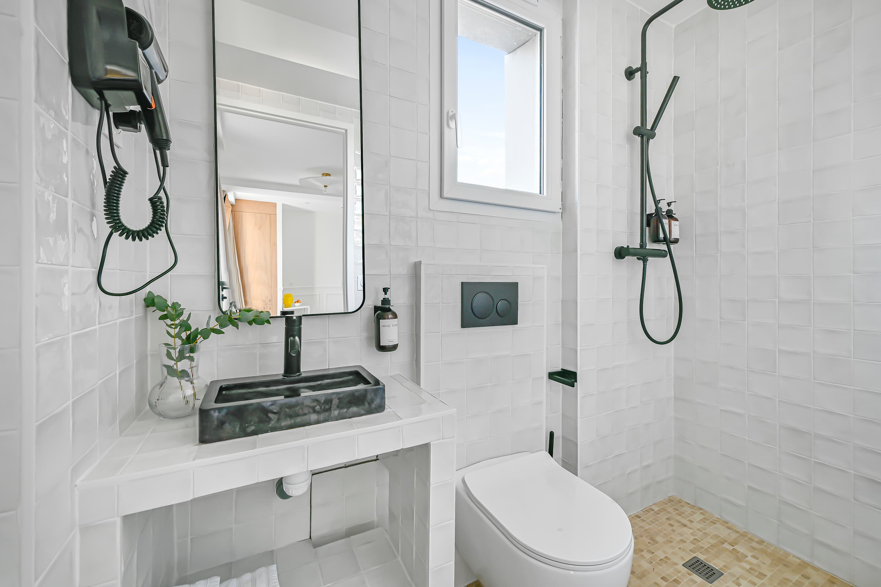 La salle de bain privative, avec une douche à effet pluie, offre un espace de relaxation.